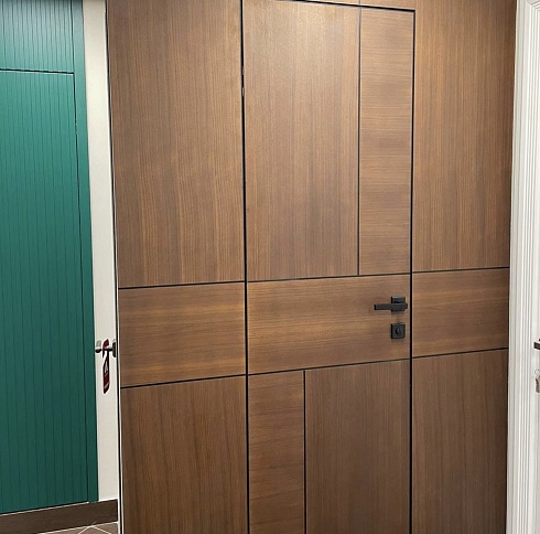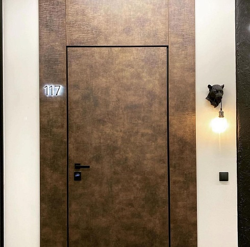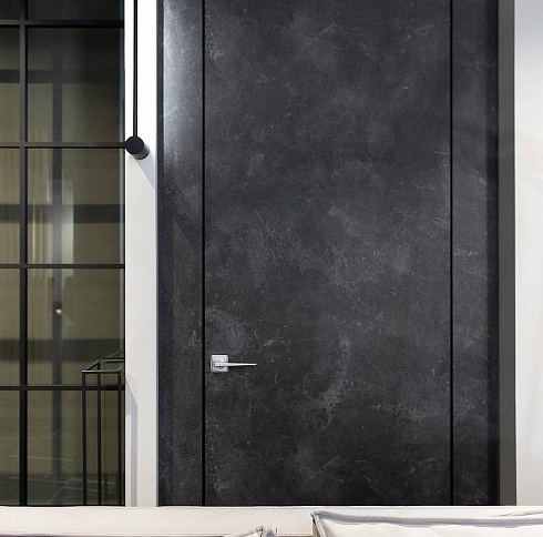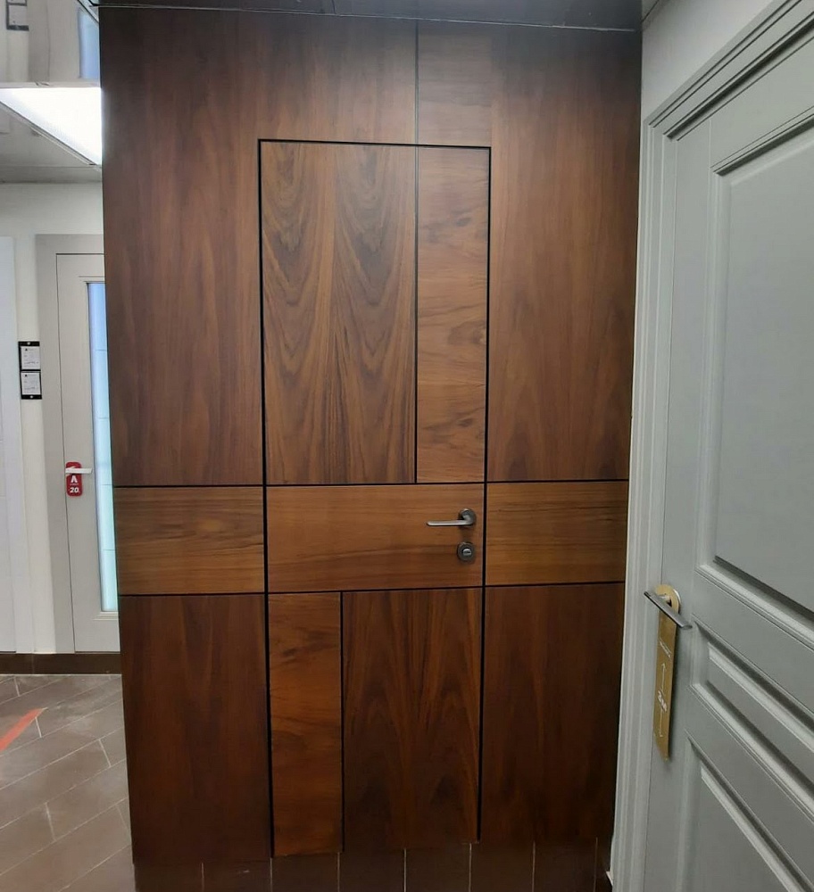 Современно и эстетично. Добавить графичности или сделать акцент именно на скрытой двери помогут современные отделки, например, шпонированные панели или оформление антивандальным материалом с имитацией природного камня. Бонус - возможность изменения облика в соответствии с новыми требованиями интерьера.