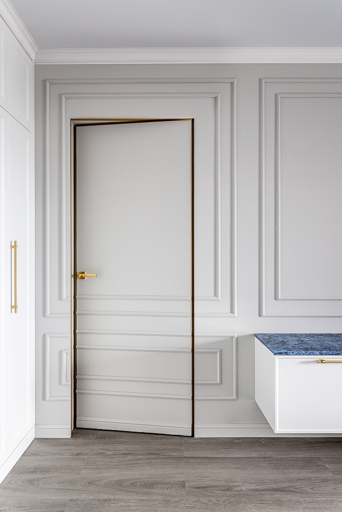 Лёгкость и изящество в каждой детали. Скрытые двери со стеклом разгружают интерьер, способствуют