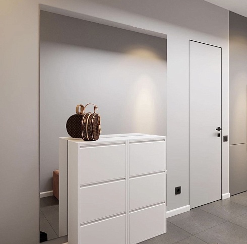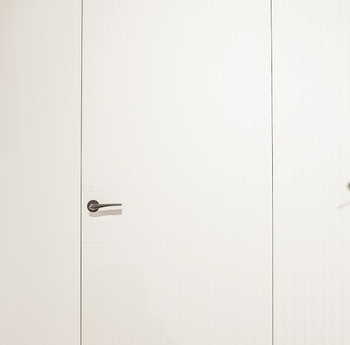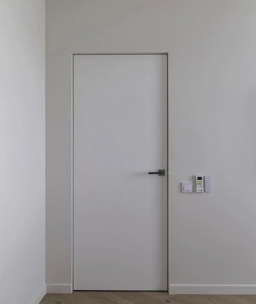 Дверь, которая растворится в дизайнерском пространстве. Универсальное решение - гладкое полотно со срытым коробом, обработанное белым грунтом.