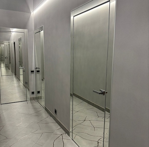 В производстве дверных полотен распространены стеклянные, пластиковые и металлические материалы. Использование зеркал и отражающих поверхностей рассеивает свет, что позволяет визуально увеличивать площадь квартиры.