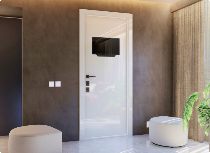 • Это умная дверь которая оснащена встроенным монитором, позволяющим вам видеть, кто находится за дверью, не открывая ее. Вы можете общаться с посетителем, не выходя из дома, и даже открыть дверь удаленно.