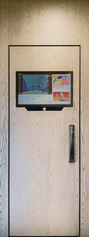 Дверь имеет выдвижную систему быстрого обслуживания, которая позволяет производить блочную замену компонентов и апгрейд без демонтажа двери или панелей. Также доступна опция подключения HD камеры для видеозвонков и видеонаблюдения. Устройство работает на базе свежего Андроид, что позволяет устанавливать все необходимые программы. Мы учли все требования по электро-безопасности внутри двери, установили специальные кабелепроходы для проводки и закрепили все компоненты прочно.