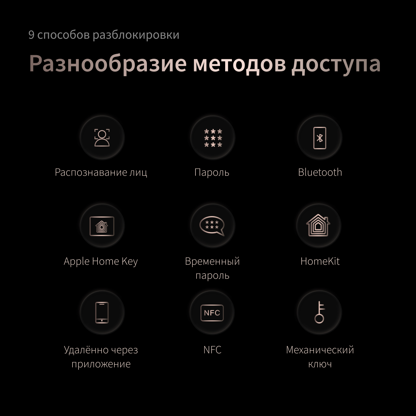 Распознавание лица, пароли, временные пароли, Bluetooth, NFC, механический ключ, HomeKit.