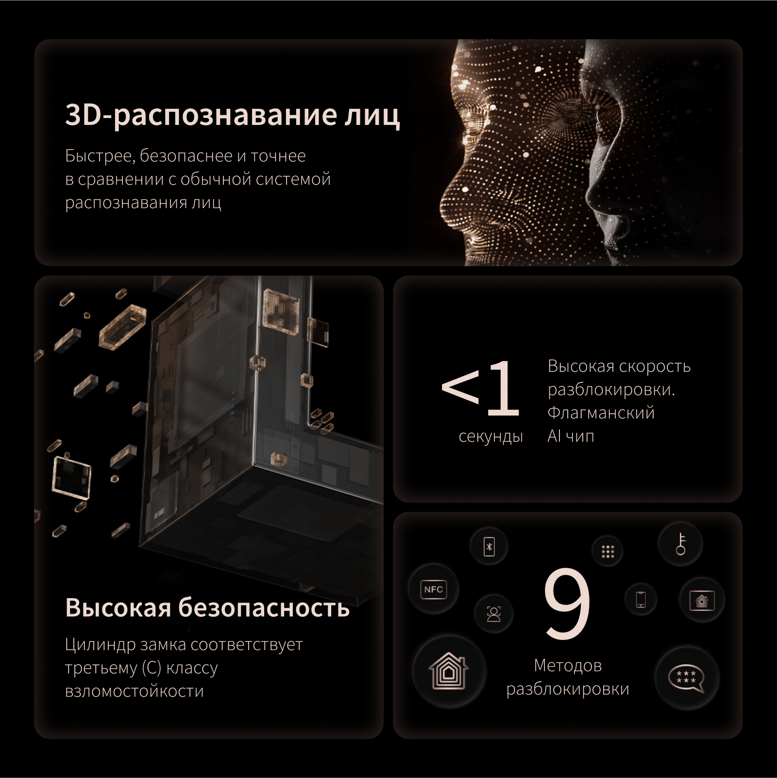 • 3D-распознавание лиц: Быстрое и точное разблокирование дверей благодаря высокоточному моделированию лица и встроенному ИИ-чипу. Продвинутые алгоритмы гарантируют высокий уровень безопасности, исключая возможность обхода системы с помощью фотографий или видео.