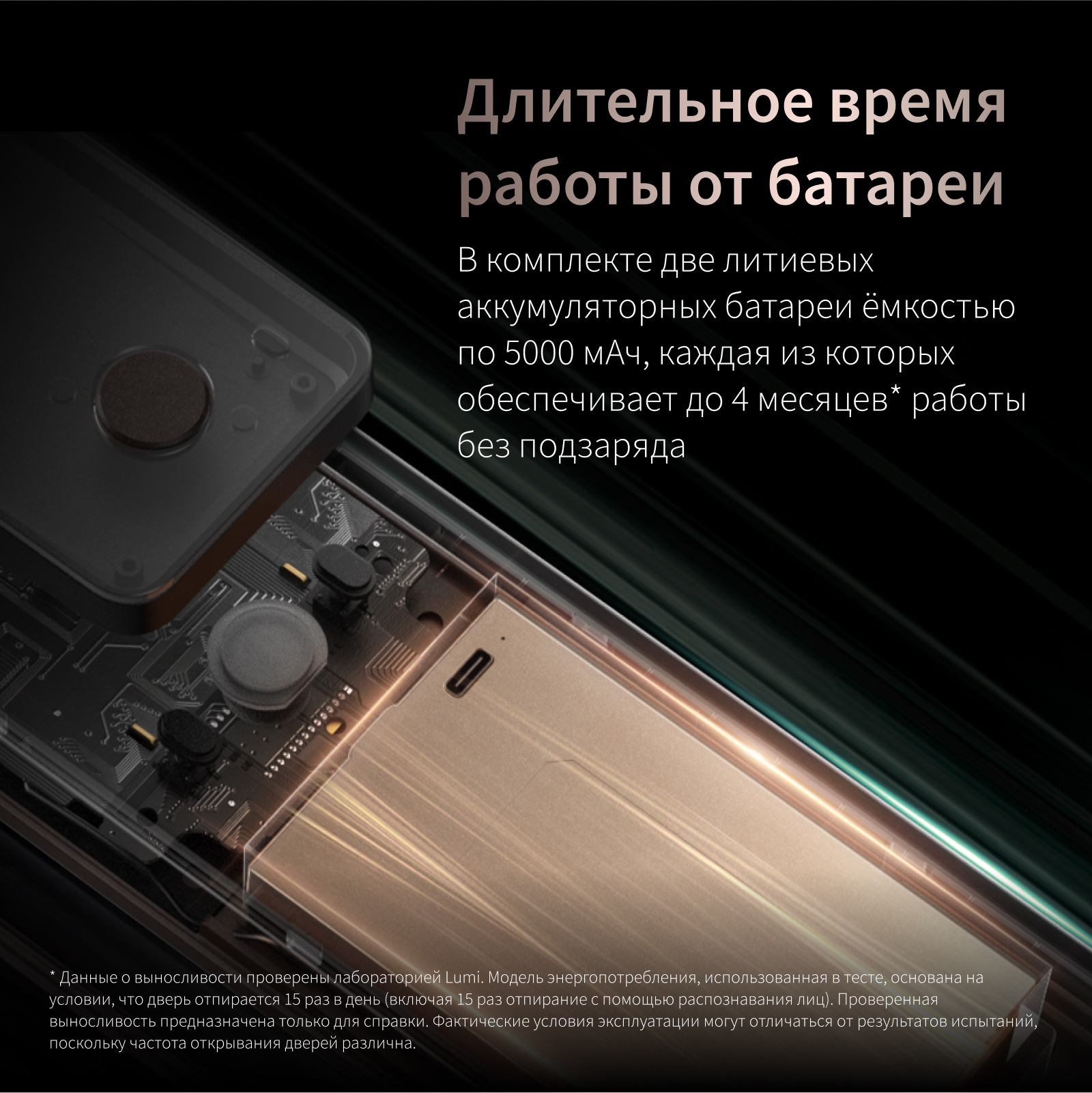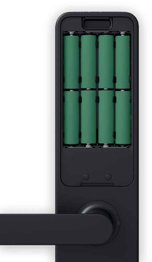Замок работает на 8 батареях типа АА, которых хватит на срок до 18 месяцев. В любом случае А100 заранее напомнит о низком заряде. Но даже если батареи сели, вы всё равно сможете открыть замок с помощью механического ключа или запитать его через порт Type-C.